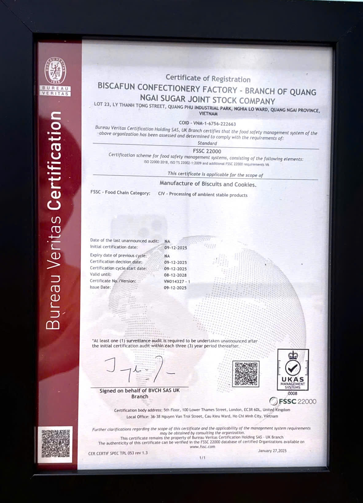 Việc dây chuyền bánh quy Biscafun đạt chứng nhận FSSC 22000 cho thấy Nhà máy đã triển khai thành công một hệ thống quản lý an toàn thực phẩm bài bản, đồng bộ và vận hành ổn định. Chứng nhận này được đánh giá và cấp bởi Bureau Veritas Certification – Tổ chức chứng nhận quốc tế uy tín hàng đầu, qua đó khẳng định năng lực sản xuất của Biscafun đáp ứng đầy đủ các chuẩn mực toàn cầu trong ngành thực phẩm.