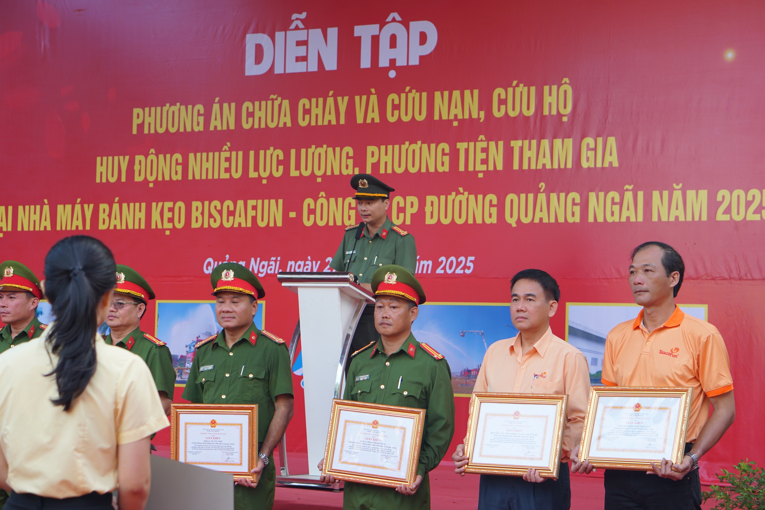 Nhân dịp này, các tập thể và cá nhân có thành tích xuất sắc trong quá trình chuẩn bị và tổ chức diễn tập đã được trao Bằng khen của Chủ tịch UBND tỉnh, Giấy khen của Giám đốc Công an tỉnh và của Tổng Giám đốc Cty CP Đường Quảng Ngãi.